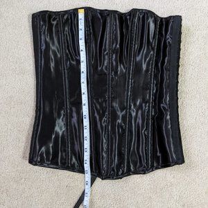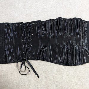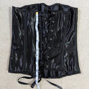 EUC Black Boned Costume Corset in Size S/M by Costumes USA with Adjustable Side Hook & Eye Closures, Adjustable Lacing at the Back, and Fabric Panel behind Lacing. Has a Satiny finish and can be used for many costumes and purposes. Only worn once for a Halloween costume and hand washed. This listing is for a single item.