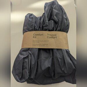 Complete travel kit by Air Transat for Business Travel. Includes a sleek gray pouch with L'Occitane hand cream and lip balm, 2 pairs of socks, blue eye mask, ear plugs, blanket, great pouch and blanket case.