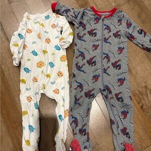 Charming one piece footies by George. White piece with colorful animal prints. Gray piece with superhero design. Ideal for bedtime fun.