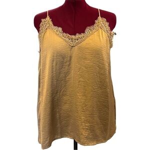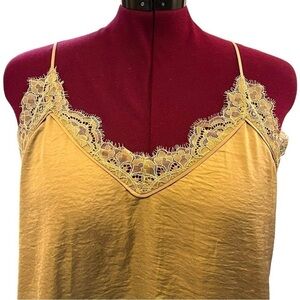 V-neck satin H&M camisole top with pretty lace trim at the bodice. Supper skinny spaghetti straps. Wear alone, under a blazer or as a layering piece. In a light olive green. Runs true to size.