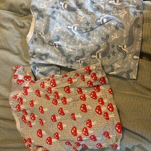 Adorable Winter Water Factory t-shirt duo made from thick, high-quality organic cotton. Both feature a sweet white collar and whimsical prints β one with mushrooms and one with mermaids. Soft, durable, and beautifully made.