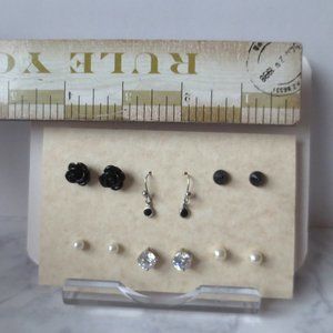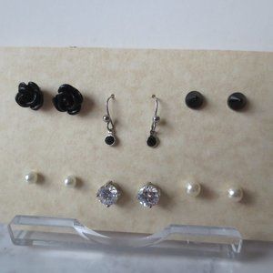 Bundle of Six Earrings S6 Black Camelia Rose Pearl and Faux Diamond Studs