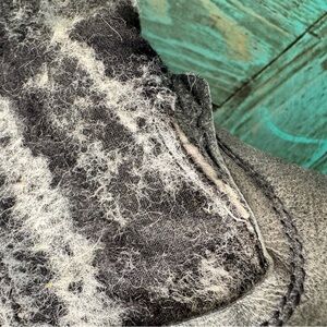Pre owned. One small part of the boot where it is barely coming from the fabric