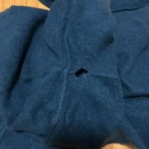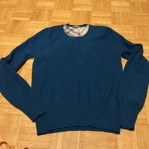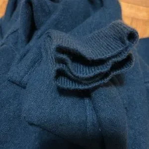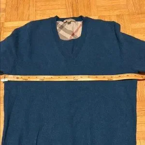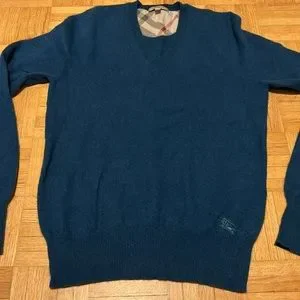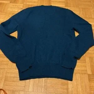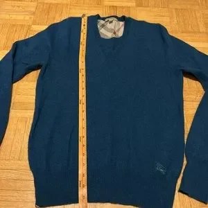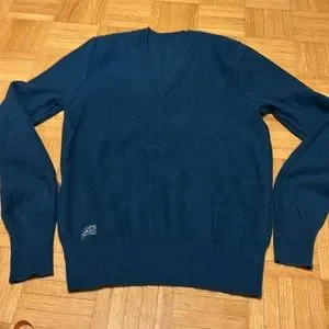 This blue V-neck sweater features a subtle knit texture, offering a classic and versatile look. Made from a comfortable knit fabric, it provides warmth and style for any occasion. The solid color design ensures it pairs effortlessly with various outfits. Stitches need to put together right on the seam under arm. I bought it in consiment store