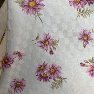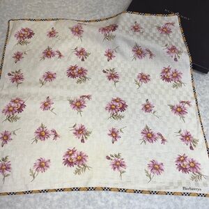 Burberry scarf featuring a soft cream background with a delicate floral print in pink tones, finished with the brand’s classic checkered border for a timeless, elegant touch.