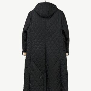 Made in England, this jacket from Burberry is crafted in a synthetic black fabric with diamond quilting all over, and features long sleeves, a mock neck with an attached hood, front snap closures, front patch pockets, a back vent, a maxi-length hem, and is lined in a beige check.
