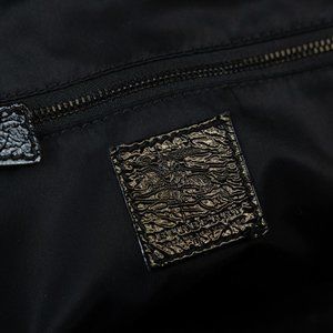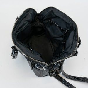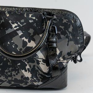 A medium crossbody tote bag with Burberry's signature Nova check nylon rendered in black and white featuring a black floral motif layered over top. This bag is trimmed in textured black patent leather on the flat base, rolled handles, long crossbody strap and zipper top closure which opens to a black nylon-lined interior with a single zip pocket and two leather trimmed slip pockets.