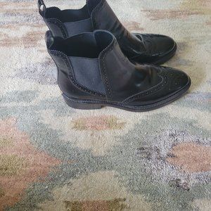 Burberry black chelsea boots with small heels with perforations and a gold-tone insert at the back.