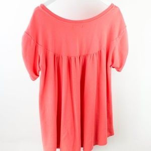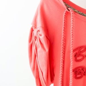 This loose tunic from Burberry’s Japanese line, Burberry Blue Label, is made in a coral french terry, and features cap bow sleeves, a scoop neck with ribbed trim and braided grommet ties, a back gathered yoke, a rounded hem, and is adorned with a cursive rope logo on the front.