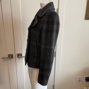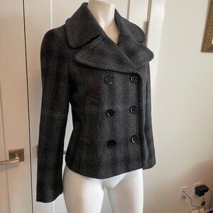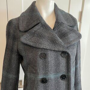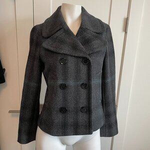 Burberry Brit Double Breasted Plaid 100% Lambswool Lined Coat Grey Blk Blue Sz 6