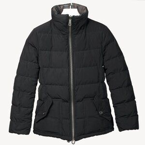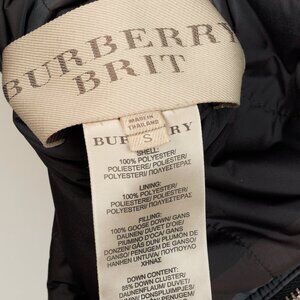 This reversible quilted goose down puffer jacket from Burberry Brit is crafted in a grey check synthetic on one side, and a solid black synthetic on the other. Insulated in a soft down, it features long sleeves, a high neck, a front zip closure, a self belt, and a drawcord hem. The grey side also offers two welt pockets, while the black side is equipped with two buttoned flap pockets.