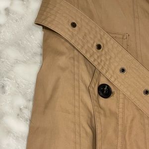 There were three luxury diffusion lines: Burberry Prorsum, Burberry London, and Burberry Brit. In 2016, all three branches were consolidated under one name, Burberry. This beautiful khaki-coloured trench coat belonged to the Burberry Brit collection, which was known as "casual weekend wear" category. The coat consists of printed Burberry Brit-buttons running from the neck line all the way down to its base. Furthermore, it is complimented with a waist belt and buckles on each end of the arms. The inside embraced Burberry's well known pattern and accompanied by a criss cross brown pattern. This coat is ideal for spring, fall, and winter fashion wear. It can also be worn during the summer time as it is not too thick. As stated in picture 8, the jacket is 100% Polyamide (nylon); upper body lining: doubler, 100% cotton, while lower body lining is 100% polyamide (nylon).