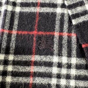 Stay warm and elegant with the classic Burberry London Check Scarf. Crafted from 100% lambswool in England, this unisex black scarf features the timeless Nova check pattern, blending sophistication with cozy comfort. Measuring a length of 62 inches excluding fringe and 11.5 inches wide, it’s a versatile accessory for fall and winter. Dry clean only. This multifunctional neck warmer is both practical and luxurious, making it a standout piece for any wardrobe.
