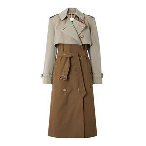 Reconstructing the classic trench, this Burberry coat features a longline silhouette with cropped jacket panels, accentuated by its two-tone colour story for a chic effect. Craftedfrom pure cotton, its traditional elements, including epaulettes, double-breasted buttons and belted cuffs, retain signature style.