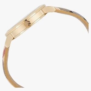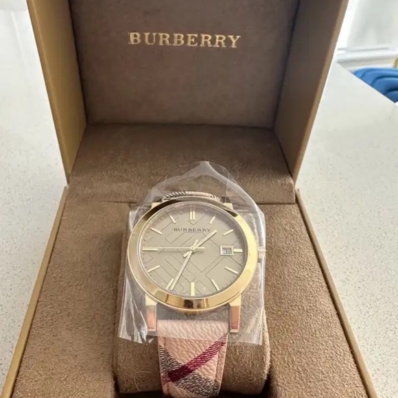 Elegant Burberry watch with a gold-tone case. Cream dial with date feature. Stylish strap with classic pattern. please note watch was never worn but the manual unfortunately did receive some water damage on the table that shows in the pictures. Quick ship!