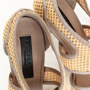 Experience elegance and style with these statement-making Burberry mesh detail heels. Made with intricate mesh lace and leather trims, these taupe coloured sandals feature open toes, cutouts, a slight platform, and a 4.5" stiletto heel. Elevate any outfit with these stunning heels, perfect for any occasion.