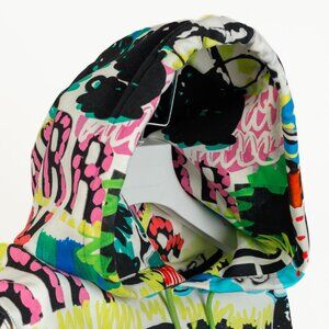 The oversized, longline Harrington hoodie from Burberry is crafted with a thick cotton french terry in an allover Bright Green pop graffiti print with accents of blue, pink, red, yellow, and black. It features long sleeves, ribbed cuffs, a drawstring hooded neckline, a front kangaroo pocket, and a ribbed banded hem.