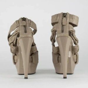 Khaki leather Burberry platform sandals with resin heels and zip closure at counters.