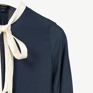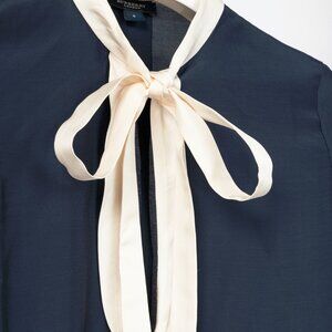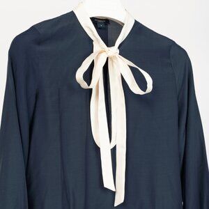 This blouse from Burberry is crafted in a drapey navy rayon, and features long sleeves, buttoned cuffs, a tie neck with white silk trim, a front keyhole, and a back pleat.