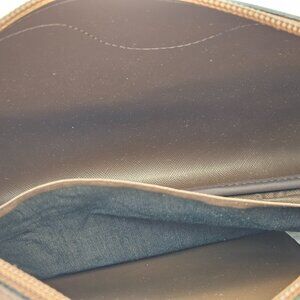 This versatile coated canvas pouch with brown leather trim is perfect for daily essentials or a night out.