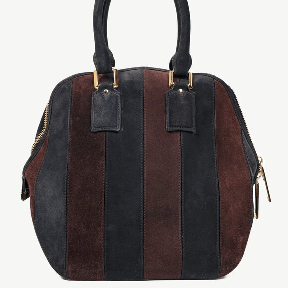 The Orchard bag from Burberry Prorsum's 2012 Autumn and Winter runway collection is a medium sartorial suede tote bag in elegant Black Currant and Plum equine stripes, and features oversize polished gold-tone metal hardware, hand-finished rolled handles with luggage-inspired suede bombé attachments, exaggerated pull-tabs, and protective base-studs. The top zip closure opens to an interior lined in black Burberry Prorsum grosgrain, and contains two slip pockets with suede trims, and a single zip pocket.