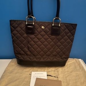 Authentic Burberry Prorsum Quilted Nylon and Calfskin leather bag with dust bag. Brown in color, the hardware is gold tone brass, the lining inside has the Burberry Equestrian Knight logo embroidered on lightweight, durable nylon. Made in Italy tote bag. Used but in excellent condition and comes with dust bag