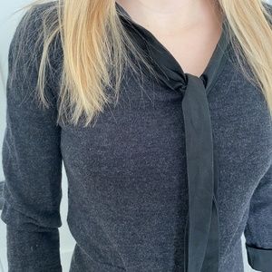 Slim fitting dark grey sweater with satin trim around neck and wrists.