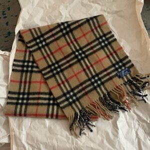 Classic Burberry plaid scarf in tan with red and black accents. Perfect for adding a touch of elegance to any outfit.