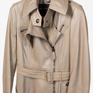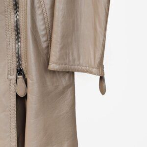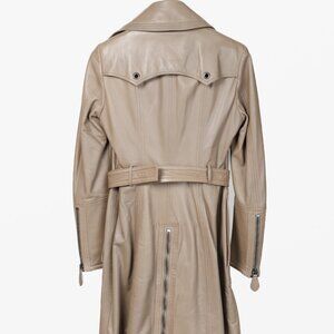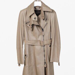 This Burberry leather moto-style trench coat in greyish-brown taupe, expertly crafted in Italy, features the distinctions of both trenchcoat and motorcycle jacket. Made of the softest leather, its classic buckle belt offers adjustable options, while the zipper details ensuring a perfect trio of luxury, comfort, and style.