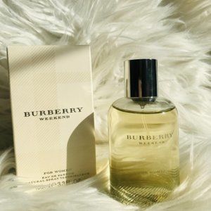 Weekend for Women by Burberry is a Floral scent, launched in 1997. Top notes are Mignonette, Mandarin Orange and Sage; middle notes are Nectarine, Blue Hyacinth, Peach Blossom, Rose Hip, iris, Red Cyclamen and Violet Root; base notes are Musk, Sandalwood and Cedar.