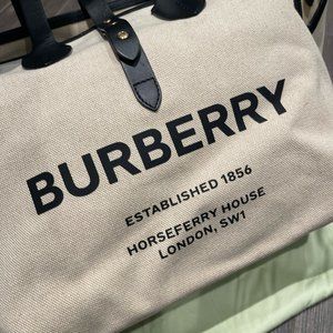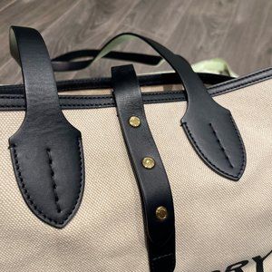 "Very new" Burberry Women's Black Logo-print Medium Cotton-canvas Tote Bag. Very good condition. Barely used. Medium size and comes with a small pouch inside.