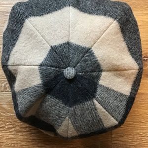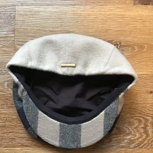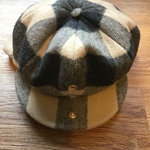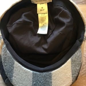 Very stylish Burberry wool hat which has never been worn. Size medium. Made in Italy. 100% wool with cotton lining. Gold Burberry detail on the back adds an nice touch.