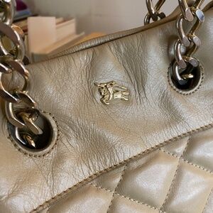 Beautiful Burberry bucket bag. Excellent, clean, preloved condition. Calf skin leather and features chain in gold with a leather shoulder bag. There are two slip pockets and a zip pocket inside. It’s vintage and unique bag.