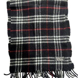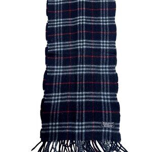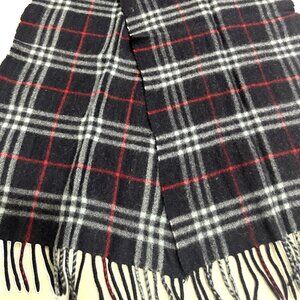 Stay warm and elegant with the classic Burberrys of London Check Scarf. Crafted from 100% cashmere in England, this unisex black scarf features the timeless Nova check pattern, blending sophistication with cozy comfort. Measuring a length of 56 inches excluding fringe and 11.5 inches wide, it’s a versatile accessory for fall and winter. Dry clean only. This multifunctional neck warmer is both practical and luxurious, making it a standout piece for any wardrobe.