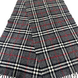 Stay warm and elegant with the classic Burberrys of London Check Scarf. Crafted from 100% Lambswool in England, this unisex black scarf features the timeless Nova check pattern, blending sophistication with cozy comfort. Measuring a length of 58 inches excluding fringe and 12 inches wide, it’s a versatile accessory for fall and winter. Dry clean only. This multifunctional neck warmer is both practical and luxurious, making it a standout piece for any wardrobe.