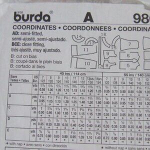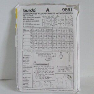 Uncut Burda sewing pattern 9861. Printed in 2002 in Offenburg, Germany. Girls sizes 7 to 12. Two piece casual suit with top and matching skirt. The recommended fabrics include jersey, knits and thin fleece.