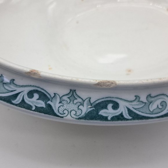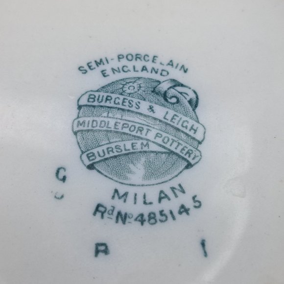 This is an antique serving bowl with a lid, or tureen, made in England by Burgess & Leigh between 1912 and 1919. It is of the rare Milan pattern, registration number 485145. It is white with floral decor in a light green. The handles are ornate and are highlighted with spots of gold. There is, surprisingly, no crazing that I can see but there are 2 chips on the rim, please see the picture of them.