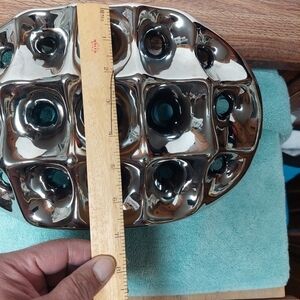 Burgett Oval Silver Ceramic Vase. Features holes throughout in a chic upscale style. Silver-coated. EUC. Pre-owned. Tiny discolouration as shown in photo on one side. Approx 10" x 7".