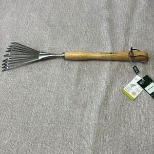 Mid Handled Shrub Rake . For clearing leaves in Borders and around plants . This versatile garden tool features a sleek silver stainless steel head and a podem handle . NEW