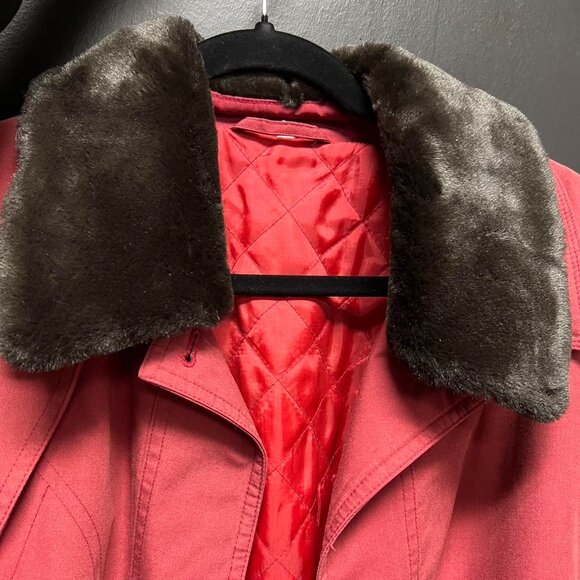 Burgundy and black vintage 90s trench coat with faux fur collar and zipper closure fashion