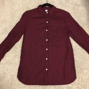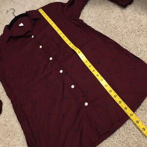 Very good preowned condition, dark burgundy button down dress shirt by Old Navy, featuring black polka-dot print throughout. Cute white buttons all the way down and at the cuffs. A very nice looking shirt that hardly looks worn if at all. Perfect for Valentine's Day.