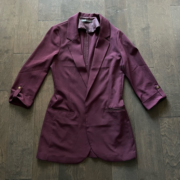 Rich burgundy blazer originally purchased from Dynamite, size XS. Blazer has pockets and an extremely flattering cut. Light material and can be worn to work or for a night out!