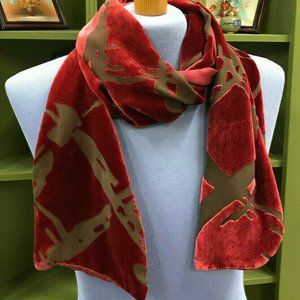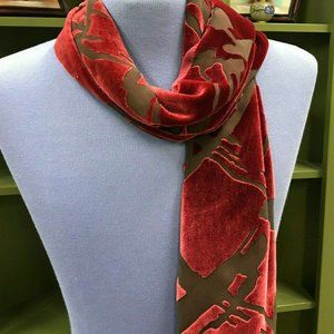 Beautiful burnout velvet wrap/scarf has an abstract pattern, with silk backing. Burgundy color, 10" x 59" oblong shape. Good pre-owned condition, the silk backing has some spots/marks on it from wear as shown in the pictures.