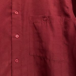 This burgundy button down short sleeved shirt has a collar, one pocket on the chest, and stitched detailing. It has been worn but is still in great condition.