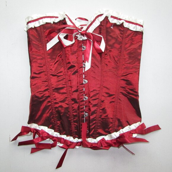Burgundy / deep red / maroon tafetta boned corset with cream ruffled top and bottom