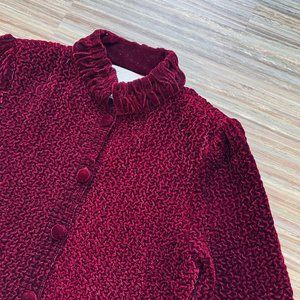 Burgundy Crushed Velvet Cardigan Jacket Ruched Texture Vintage Jeune Jeunesse