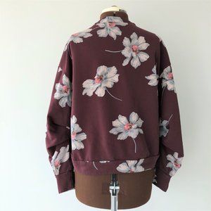 Burgundy sweatshirt with grey florals and pleats at elbow to create a statement sleeve. Oversized with extended shoulders with full sleeves is comfortable and cozy!
