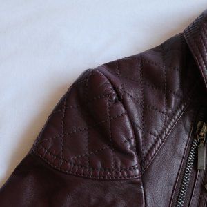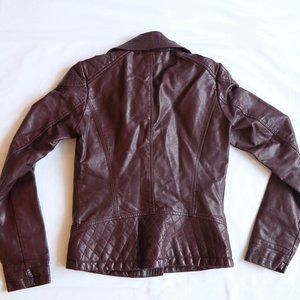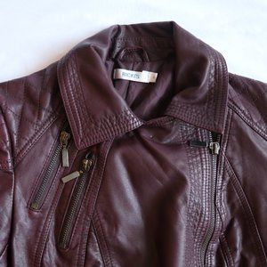 Burgundy/brown faux leather jacket from Ricki's. Gently worn (under 5 times) and great for chilly fall days! Temporary wrinkles in photos from being stored away for a little while.