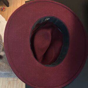 Burgundy felt hat with wide brim and thin black belt detail on top. It’s just over 21inches head width. I bought this from a boutique in Montreal but only wore it a few times and it’s just sitting in my closet unloved.