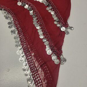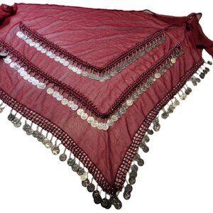 Burgundy Red Maroon Hip Scarf 3 Cascading Rows of Silver Coins Sheer Wrap Skirt